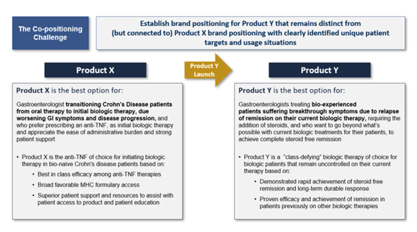 When establishing a co-positioning strategy for launching a product, marketing needs to ensure that there is clarity around the unmet medical need each product addresses and that they do not compete with each other. Clear, focused articulation of the co-positioning helps HCPs recognize appropriate patients and usage situations to get the best therapy to patients.